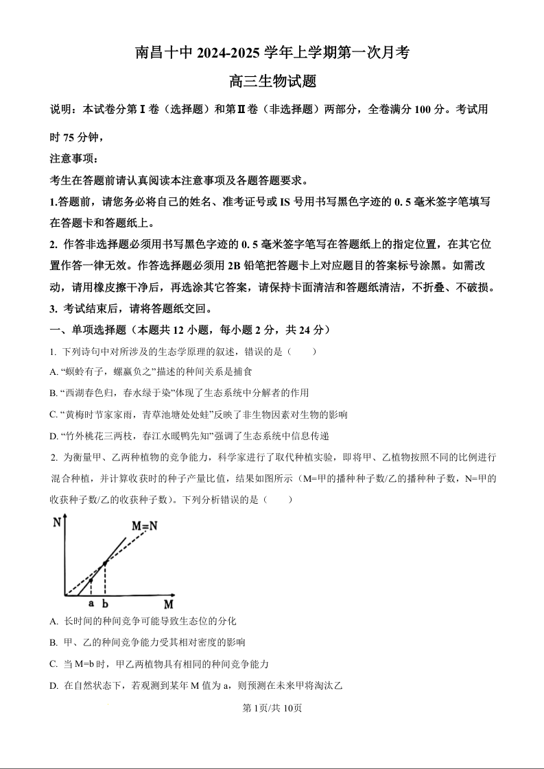 江西省南昌市第十中学2024-2025学年高三上学期第一次月考 生物