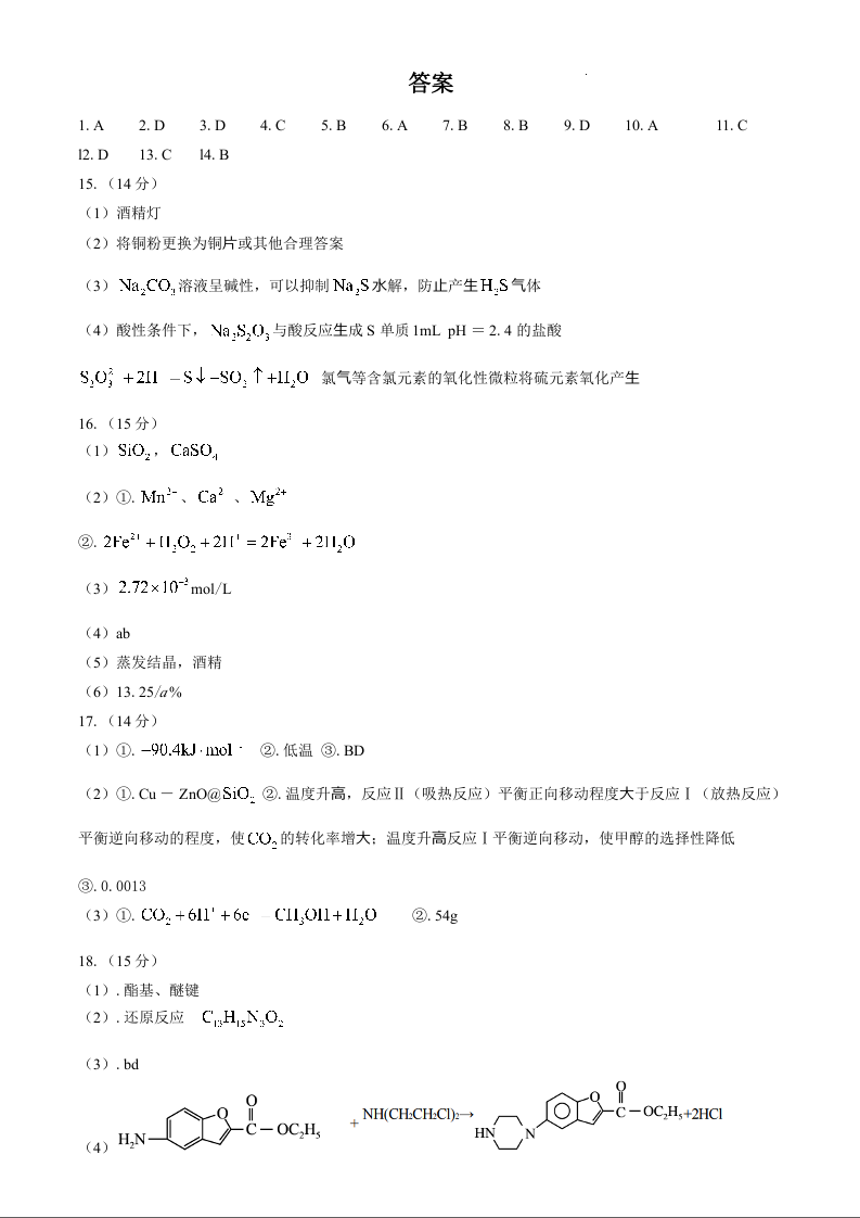 江西省南昌市第十中学2024-2025学年高三上学期第一次月考 化学答案