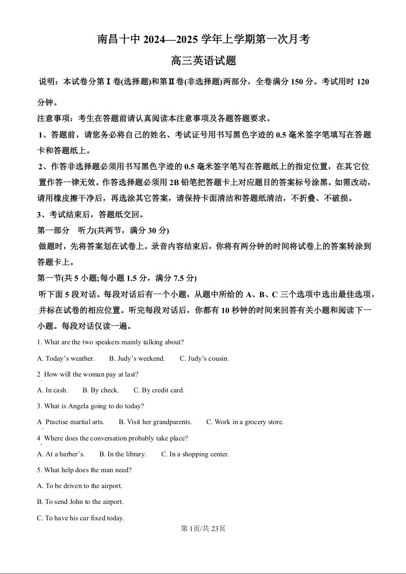 江西省南昌市第十中学2024-2025学年高三上学期第一次月考 英语答案