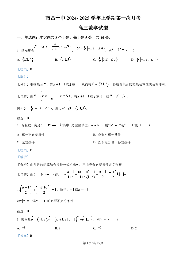 江西省南昌市第十中学2024-2025学年高三上学期第一次月考 数学答案