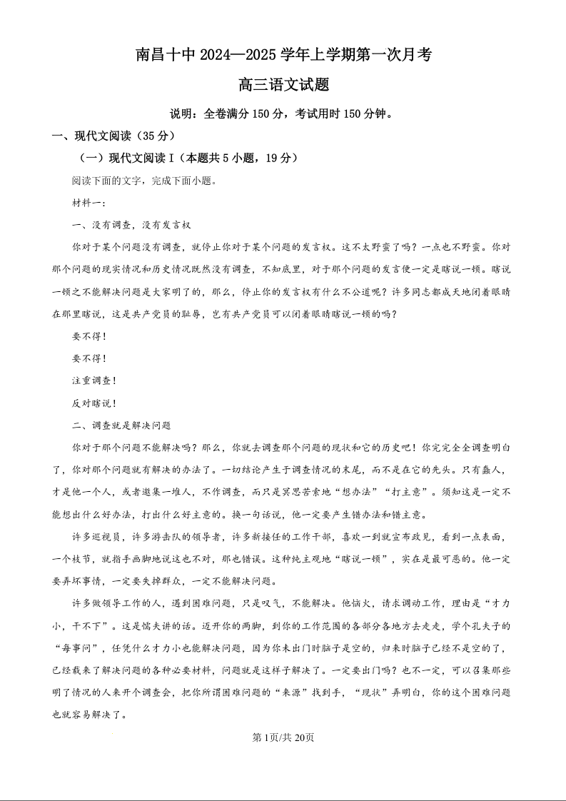 江西省南昌市第十中学2024-2025学年高三上学期第一次月考 语文答案