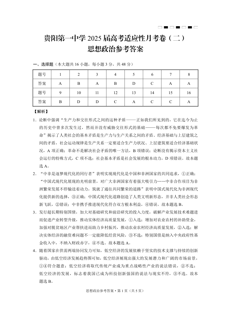贵州省贵阳市第一中学2025届高三上学期高考适应性月考(二)政治答案
