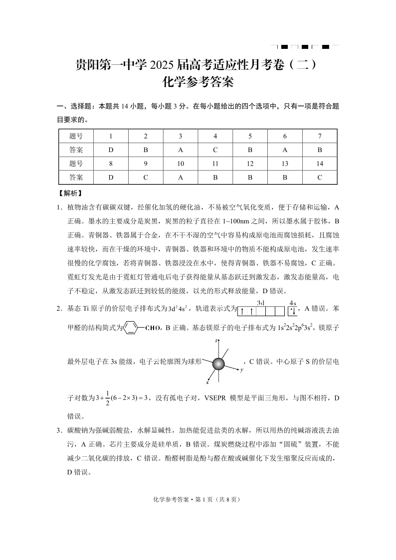 贵州省贵阳市第一中学2025届高三上学期高考适应性月考(二)化学答案