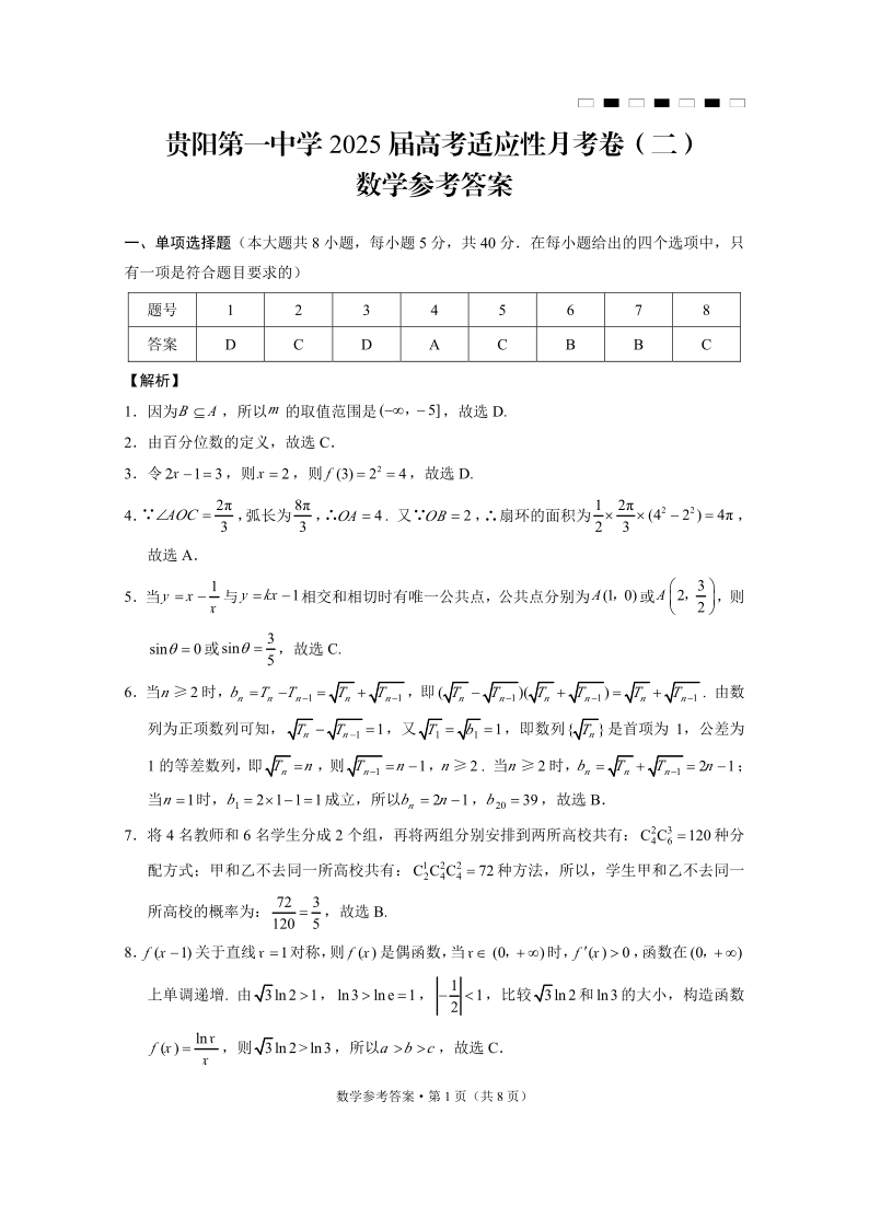 贵州省贵阳市第一中学2025届高三上学期高考适应性月考(二)数学答案