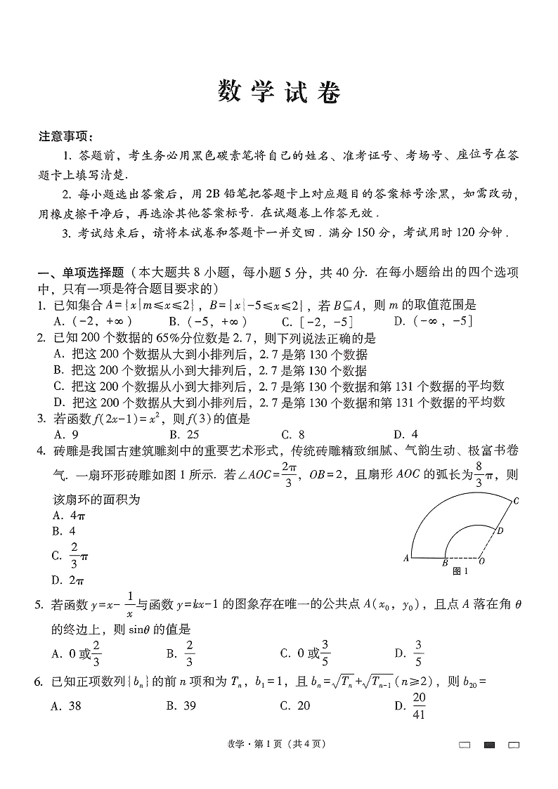 贵州省贵阳市第一中学2025届高三上学期高考适应性月考(二)数学