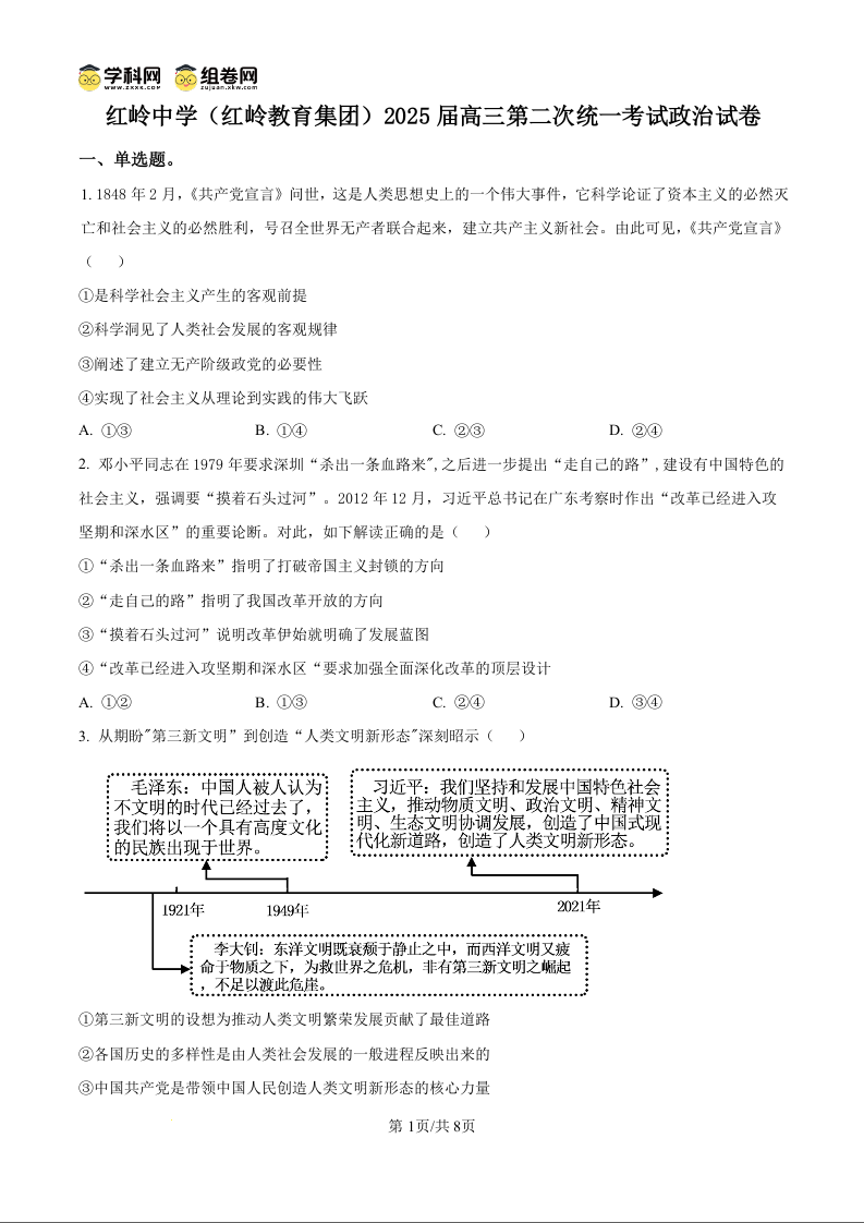 红岭中学(红岭教育集团)2025届高三第二次统一考试 政治
