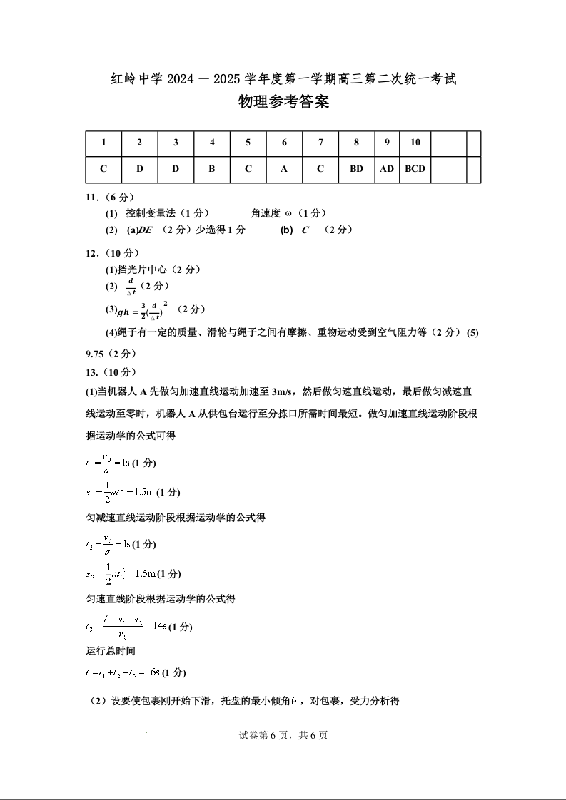 红岭中学(红岭教育集团)2025届高三第二次统一考试 物理答案