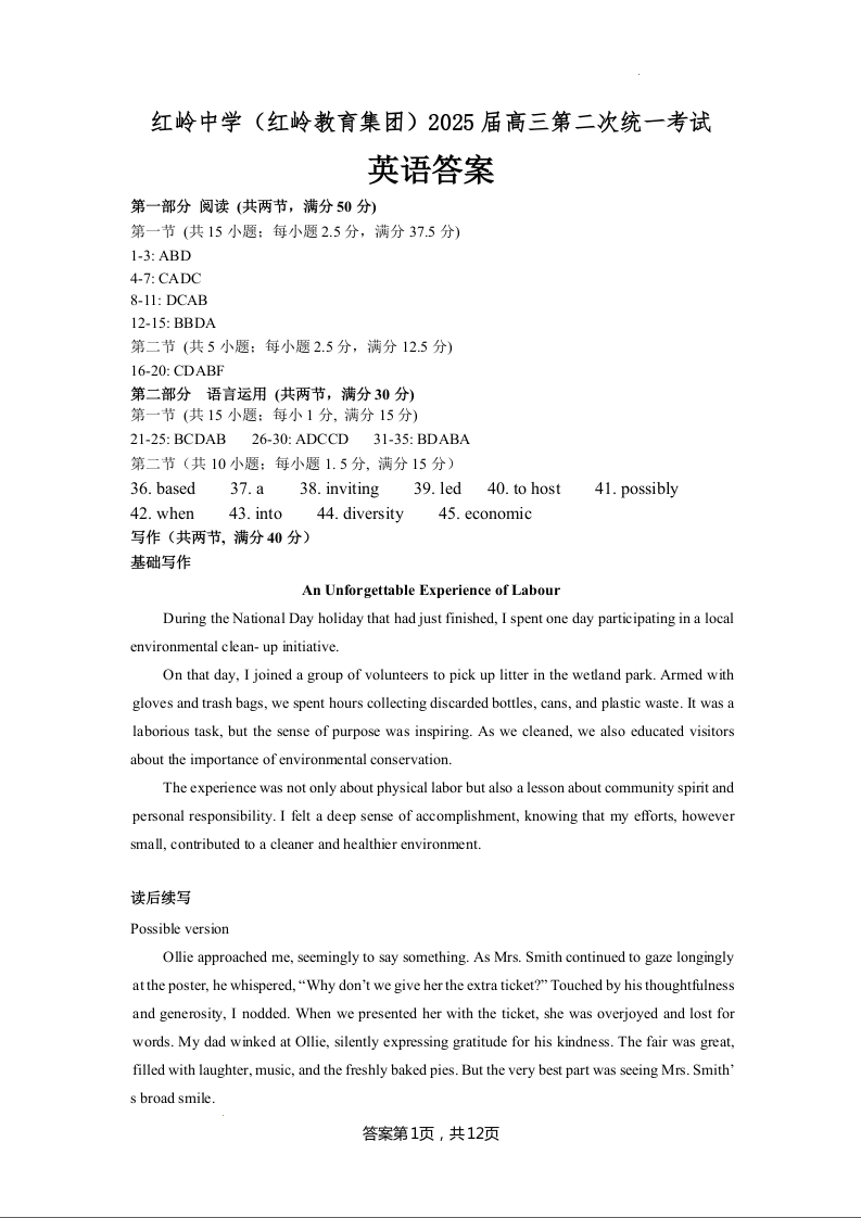 红岭中学(红岭教育集团)2025届高三第二次统一考试 英语答案