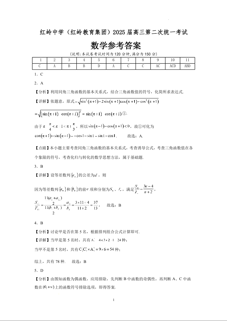 红岭中学(红岭教育集团)2025届高三第二次统一考试 数学答案