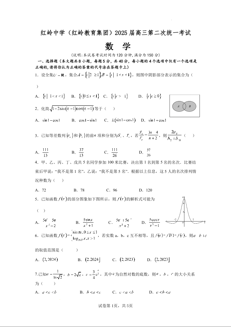 红岭中学(红岭教育集团)2025届高三第二次统一考试 数学