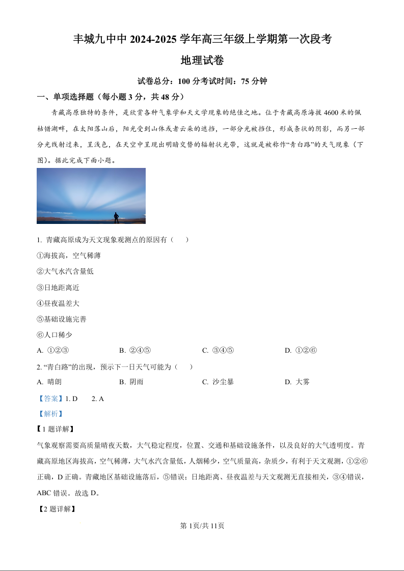 江西省宜春市丰城市第九中学2024-2025学年高三上学期第一次段考 地理答案