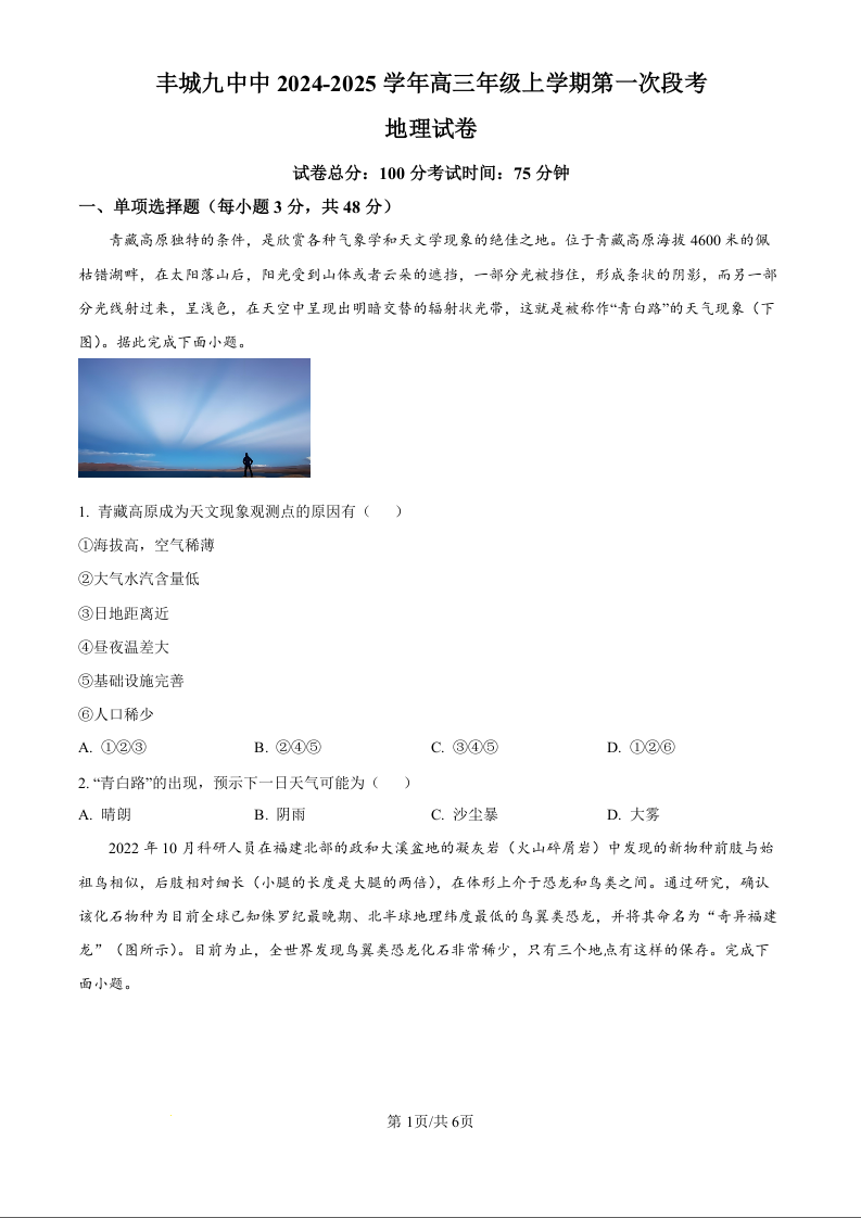 江西省宜春市丰城市第九中学2024-2025学年高三上学期第一次段考 地理