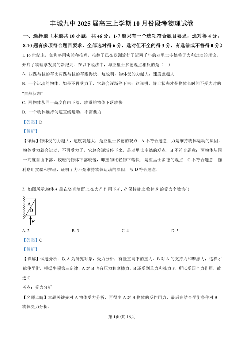 江西省宜春市丰城市第九中学2024-2025学年高三上学期第一次段考 物理答案