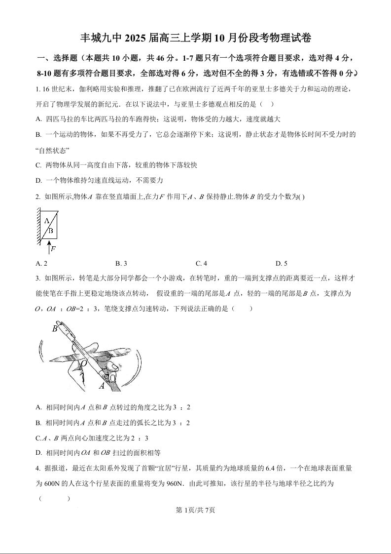 江西省宜春市丰城市第九中学2024-2025学年高三上学期第一次段考 物理