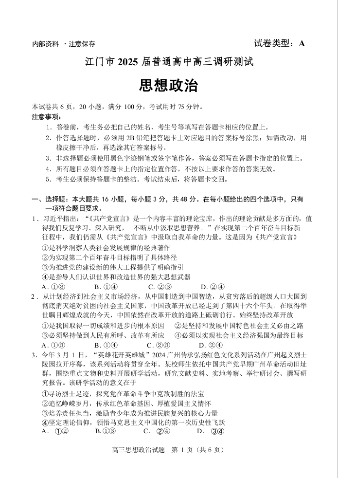 广东省江门市2025届高三上学期10月调研考试 政治