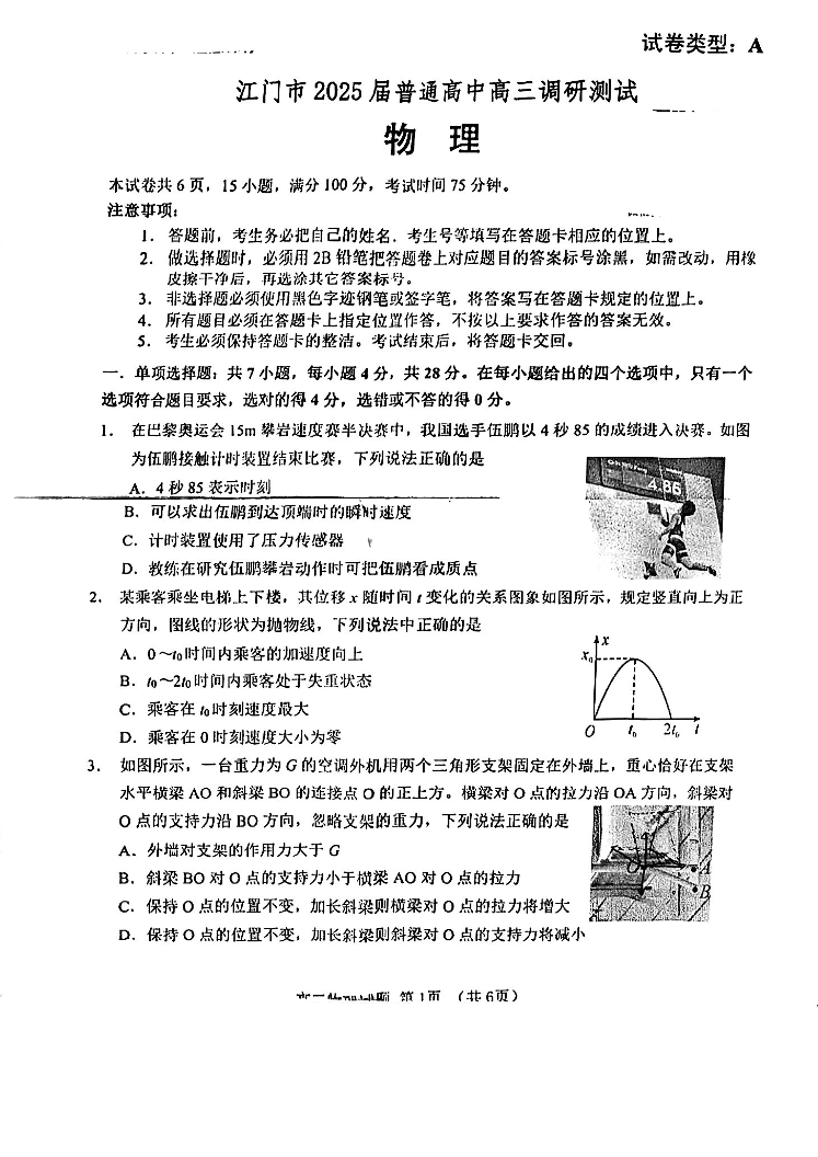 广东省江门市2025届高三上学期10月调研考试 物理