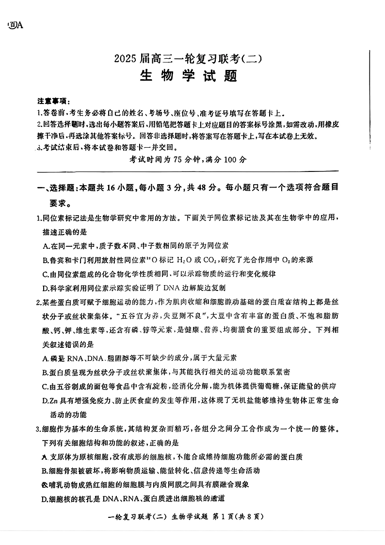 百师联盟2025届高三年级一轮复习月考卷(二)生物