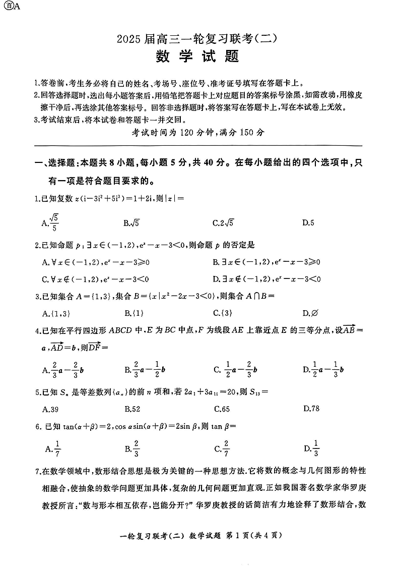 百师联盟2025届高三年级一轮复习月考卷(二)数学