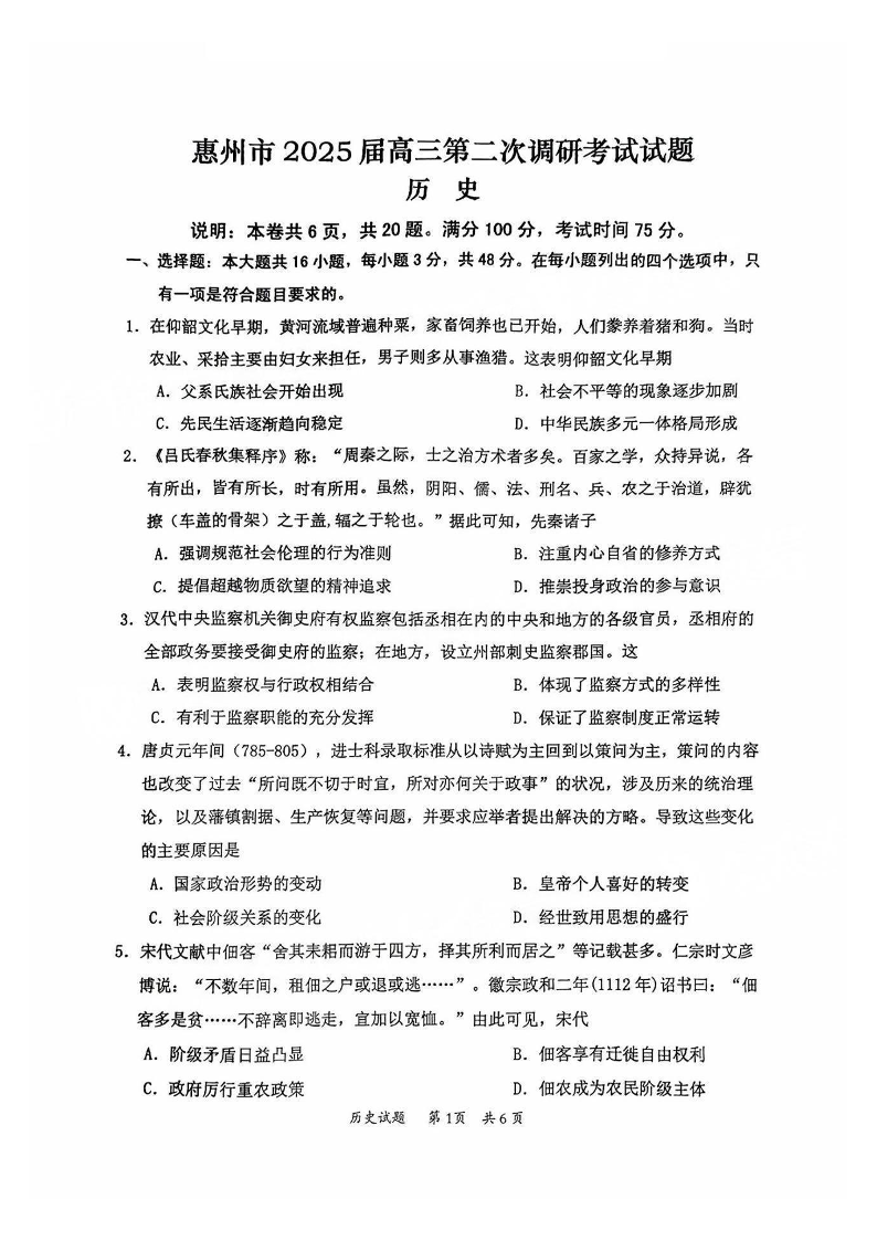 广东省惠州市2025届高三第二次调研考试(惠州二调)历史