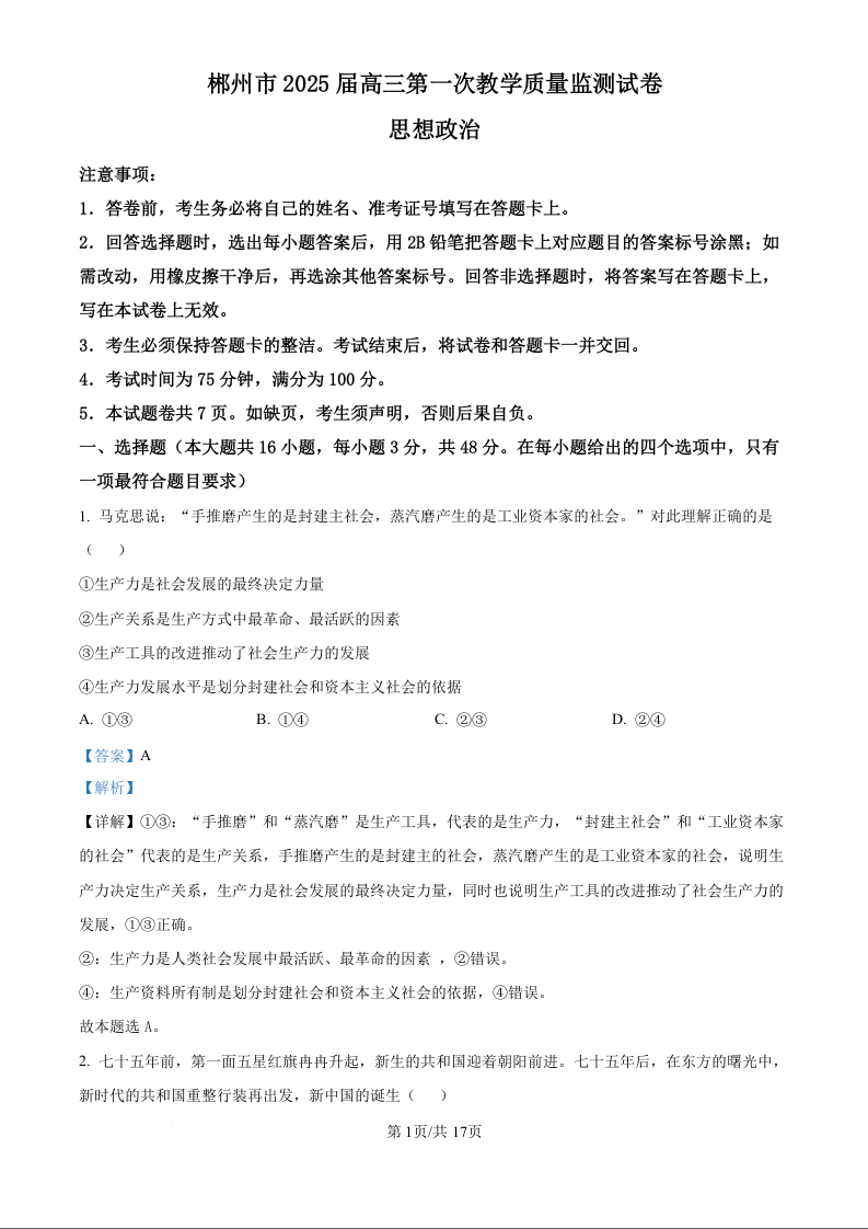 湖南省郴州市2025届高三上学期第一次模拟考试 政治答案