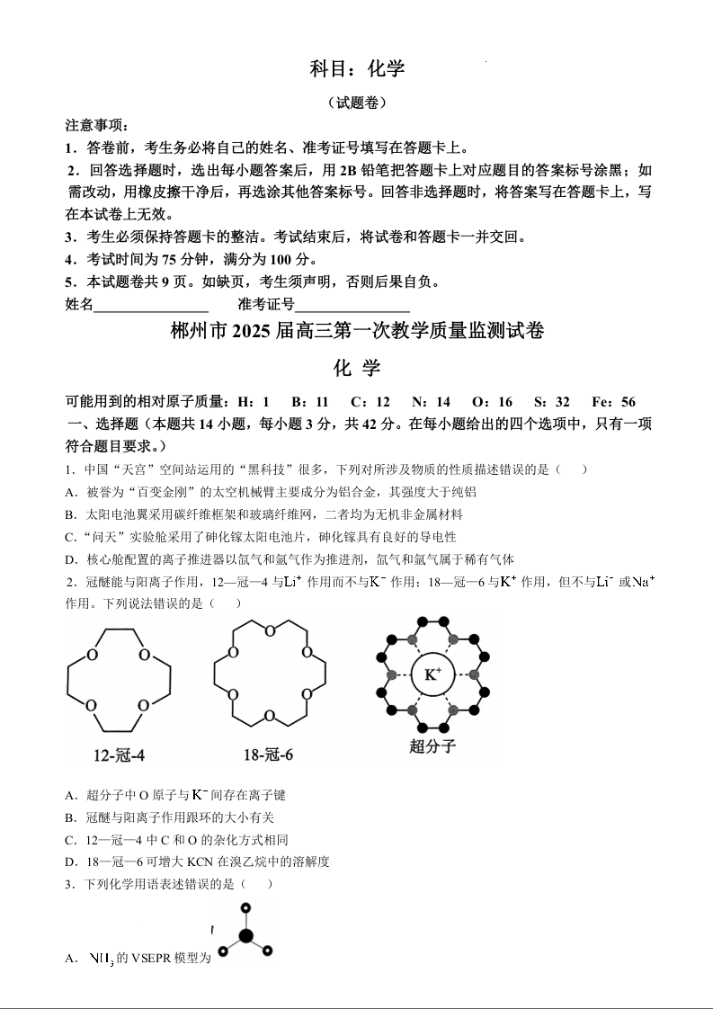 湖南省郴州市2025届高三上学期第一次模拟考试 化学