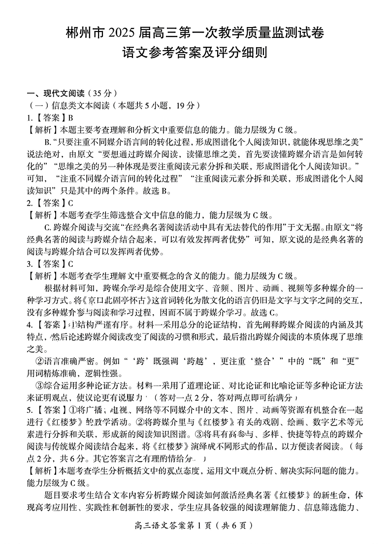 湖南省郴州市2025届高三上学期第一次模拟考试 语文答案