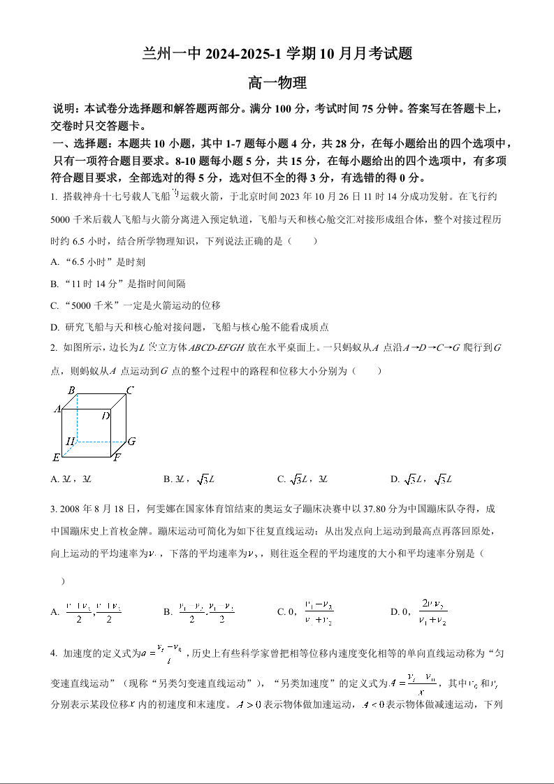 甘肃省兰州第一中学2024-2025学年高一上学期10月月考 物理