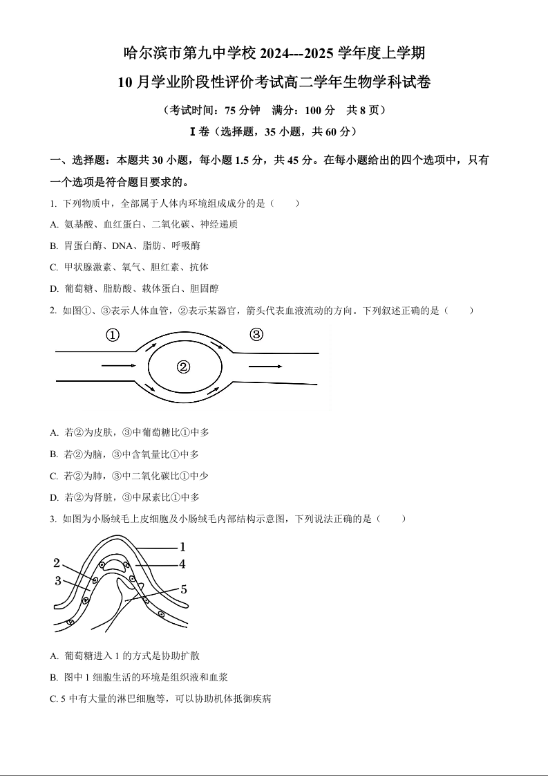 黑龙江省哈尔滨市第九中学2024-2025学年高二上学期10月月考 生物