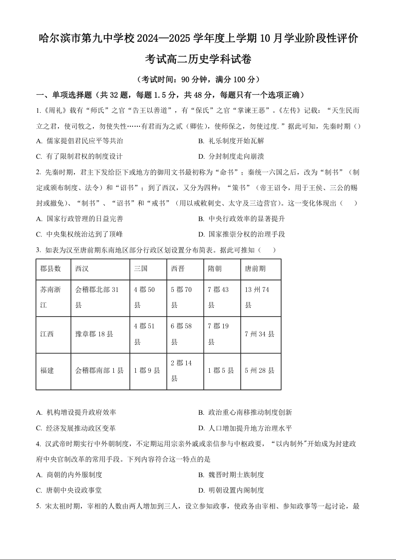 黑龙江省哈尔滨市第九中学2024-2025学年高二上学期10月月考 历史