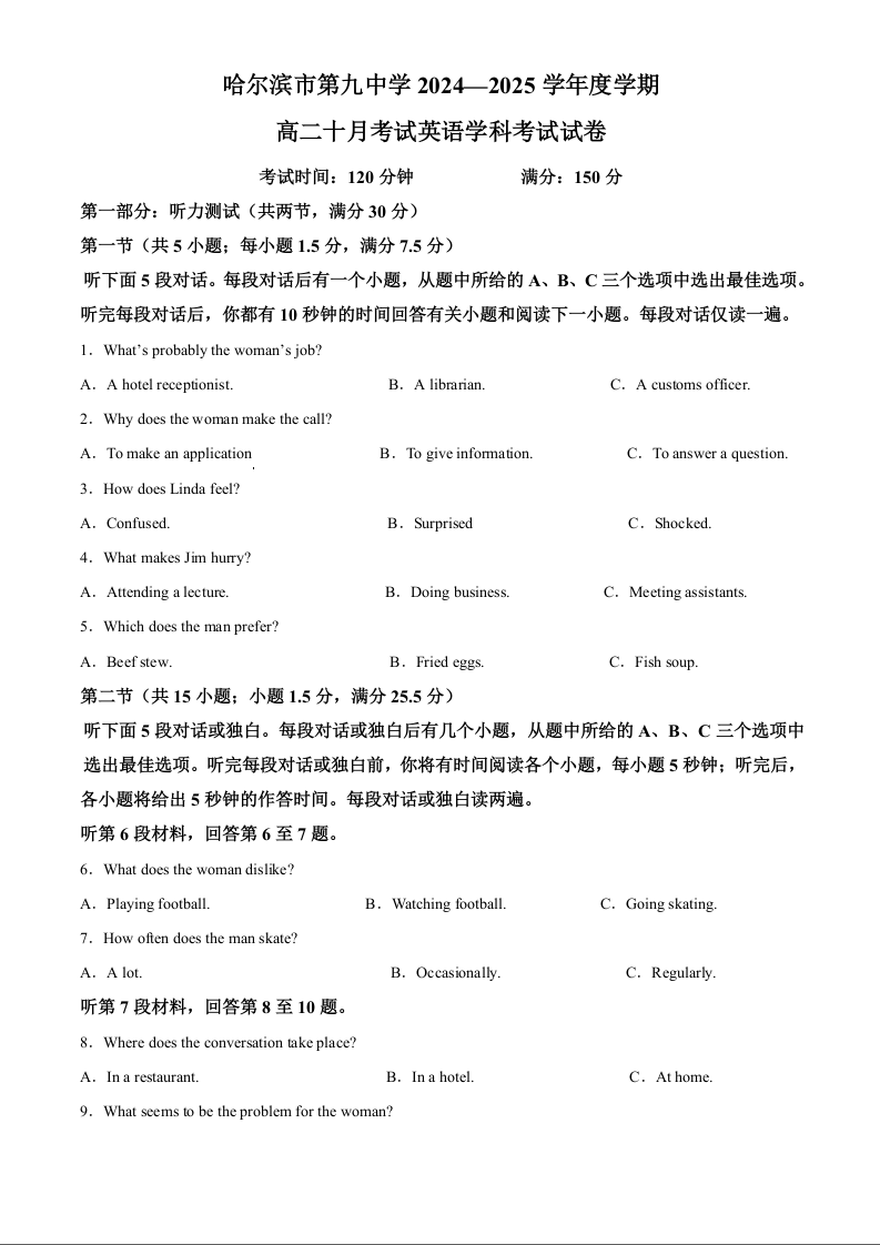 黑龙江省哈尔滨市第九中学2024-2025学年高二上学期10月月考 英语