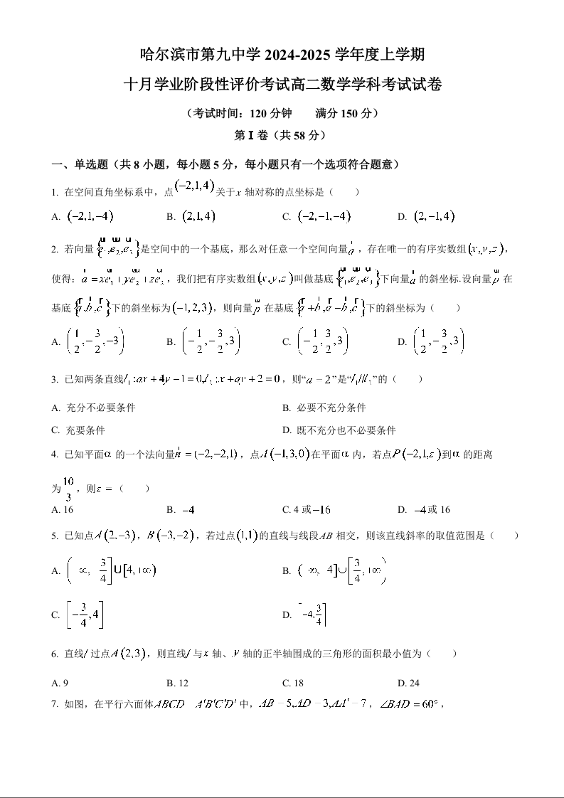 黑龙江省哈尔滨市第九中学2024-2025学年高二上学期10月月考 数学