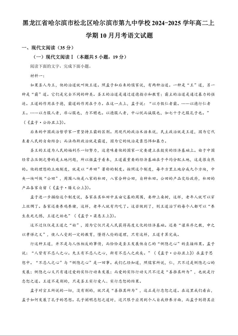 黑龙江省哈尔滨市第九中学2024-2025学年高二上学期10月月考 语文