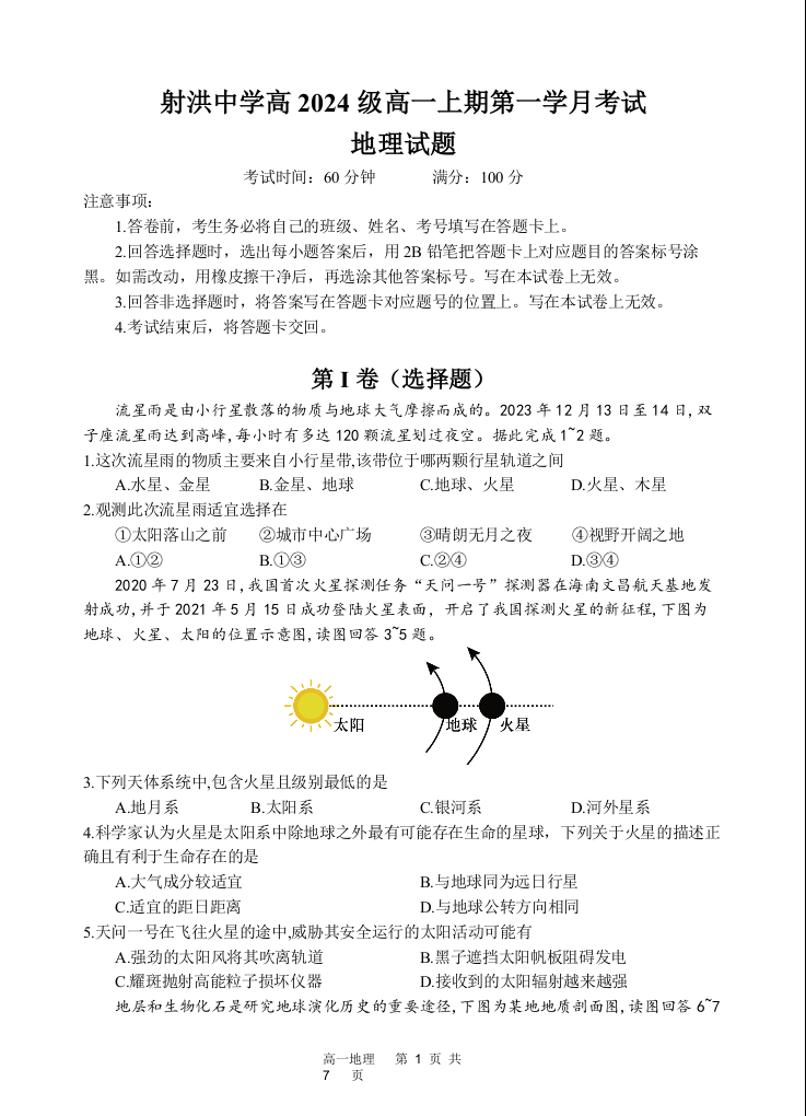 四川省遂宁市射洪中学2024-2025学年高一第一学期月考 地理