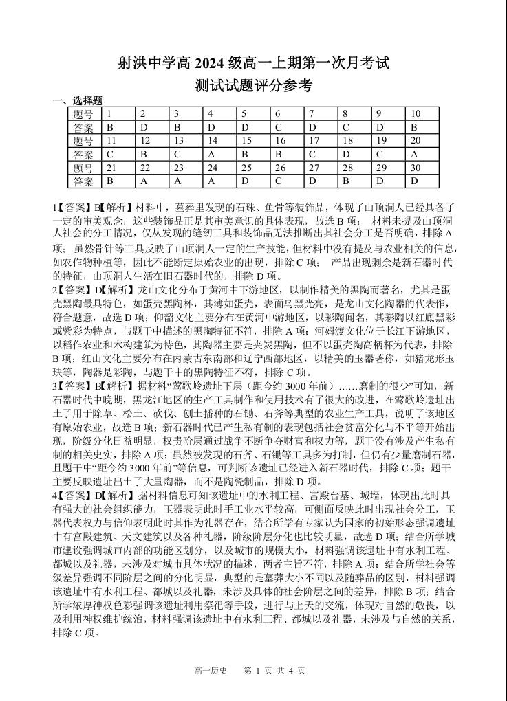 四川省遂宁市射洪中学2024-2025学年高一第一学期月考 历史答案