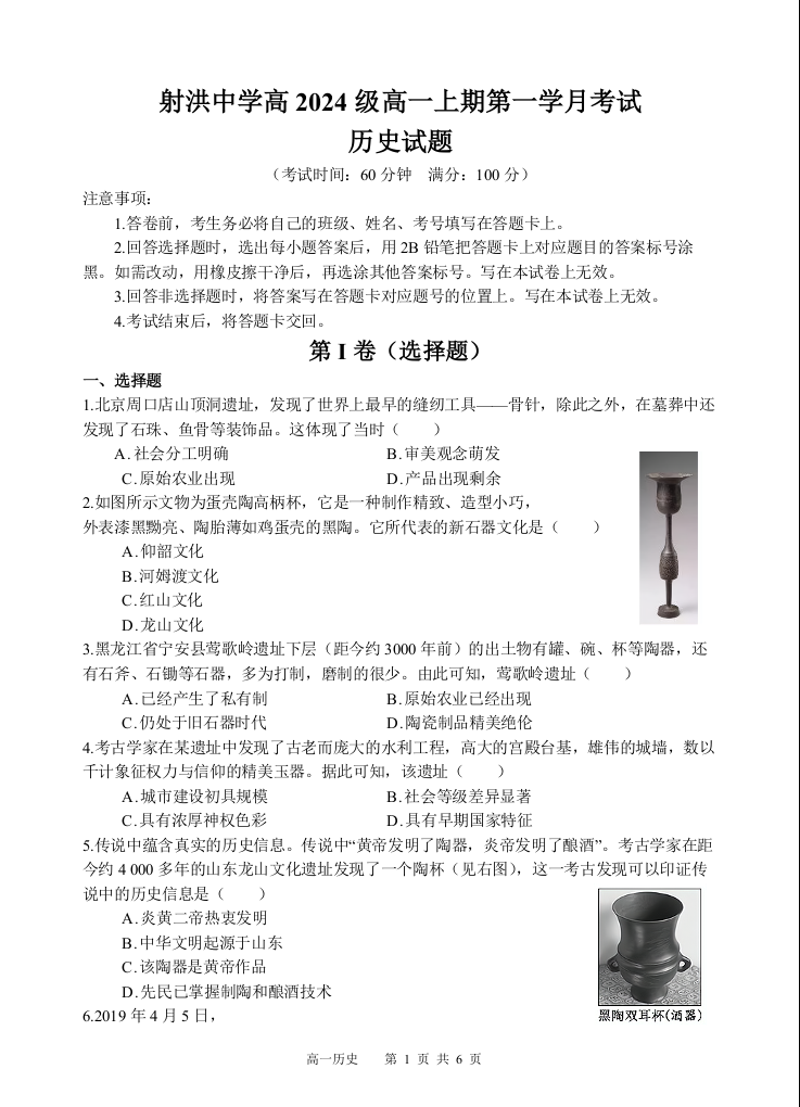 四川省遂宁市射洪中学2024-2025学年高一第一学期月考 历史
