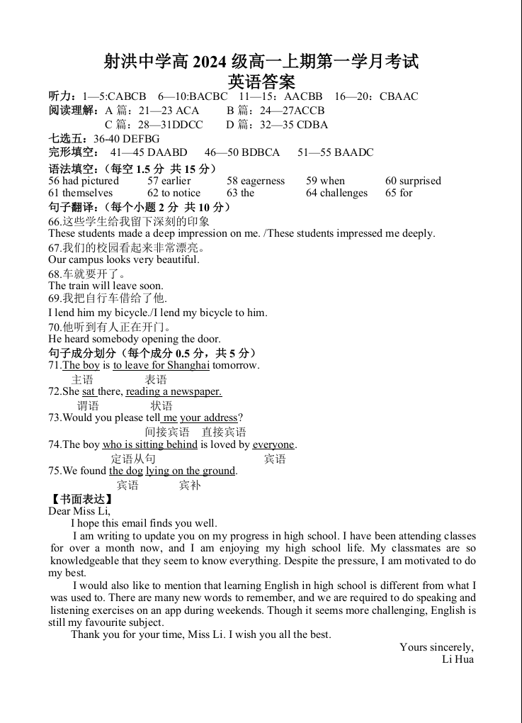 四川省遂宁市射洪中学2024-2025学年高一第一学期月考 英语答案