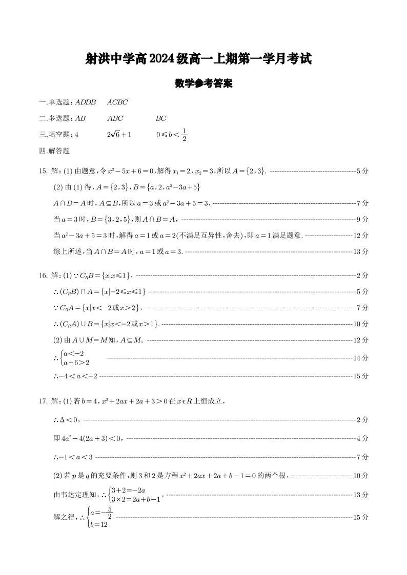 四川省遂宁市射洪中学2024-2025学年高一第一学期月考 数学答案
