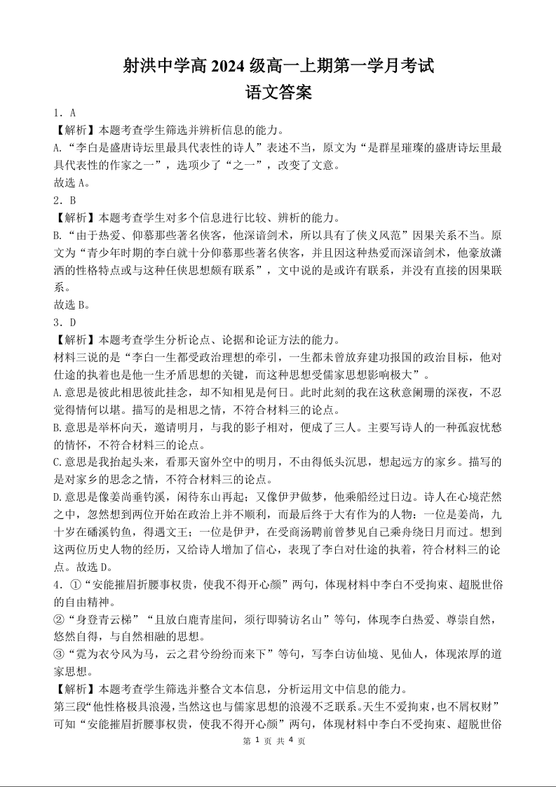 四川省遂宁市射洪中学2024-2025学年高一第一学期月考 语文答案
