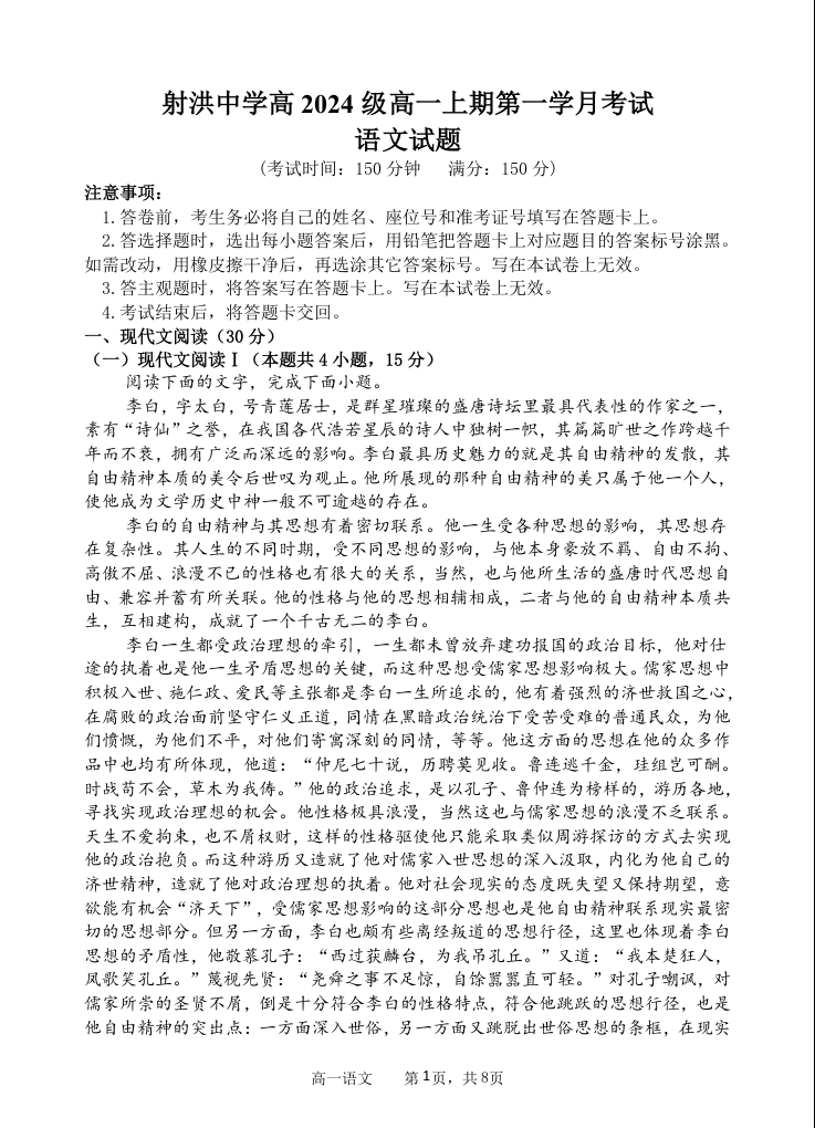 四川省遂宁市射洪中学2024-2025学年高一第一学期月考 语文