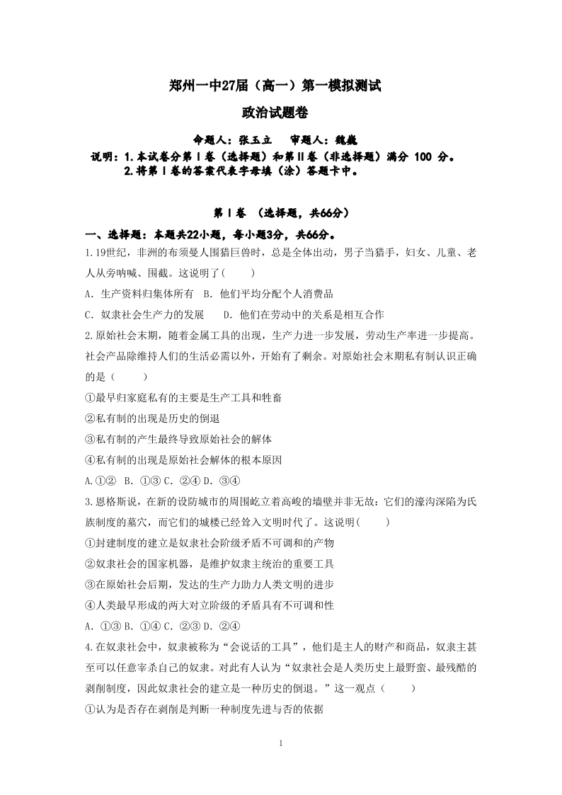 河南省郑州市第一中学2024-2025学年高一上学期第一次月考 政治