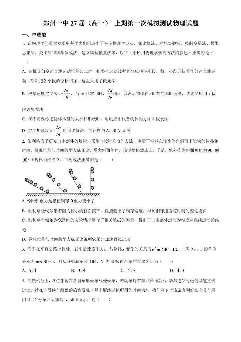 河南省郑州市第一中学2024-2025学年高一上学期第一次月考 物理