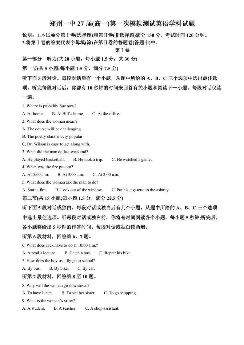 河南省郑州市第一中学2024-2025学年高一上学期第一次月考 英语