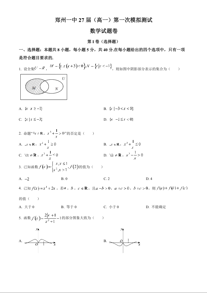河南省郑州市第一中学2024-2025学年高一上学期第一次月考 数学