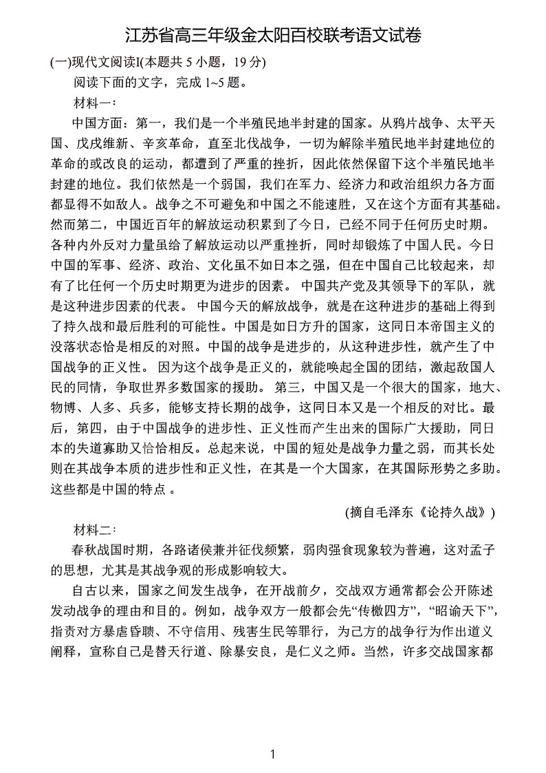 江苏省2025届高三10月百校联考 语文