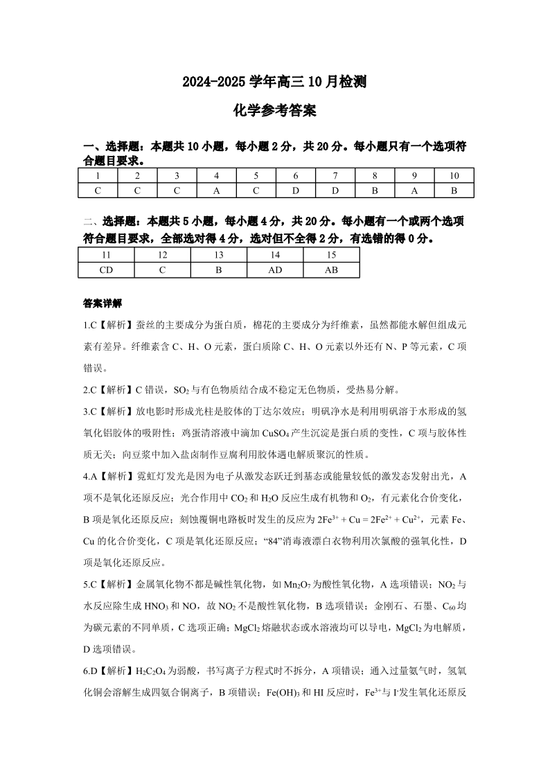 山东省中昇大联考2024-2025学年高三10月联考 化学答案