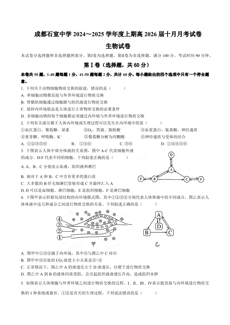 四川省成都市石室中学2024-2025学年高二上学期10月月考 生物