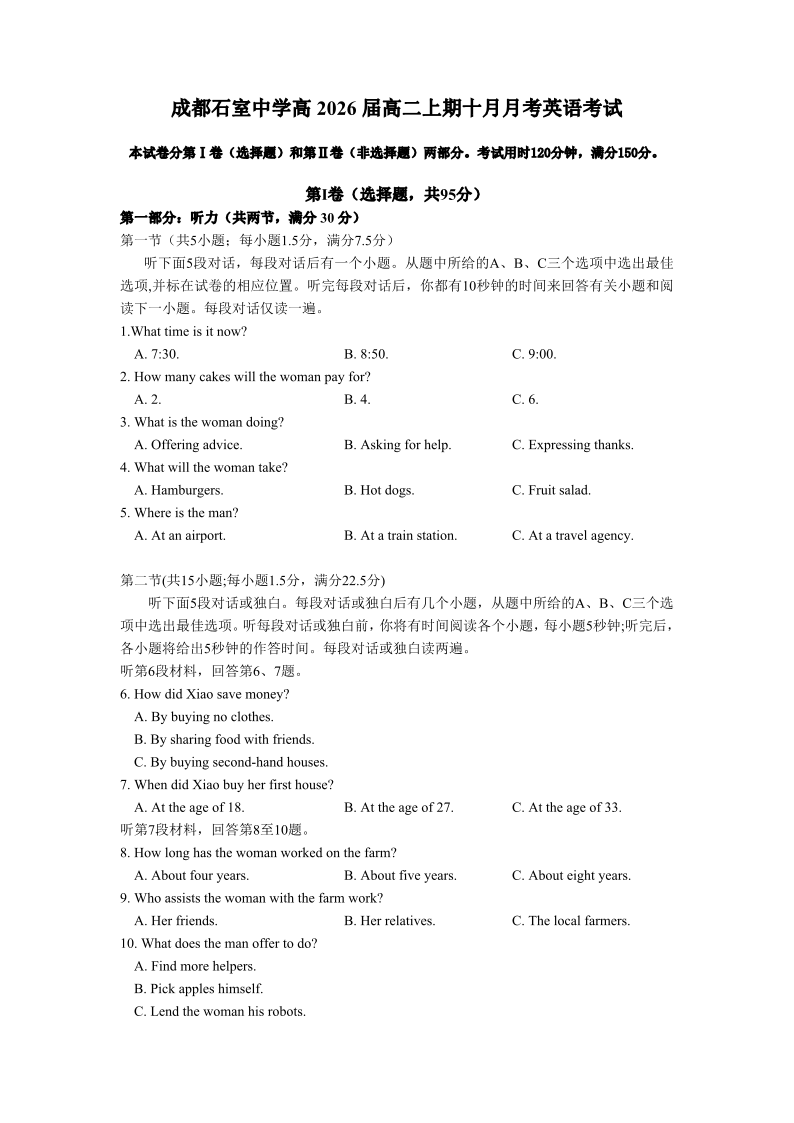 四川省成都市石室中学2024-2025学年高二上学期10月月考 英语