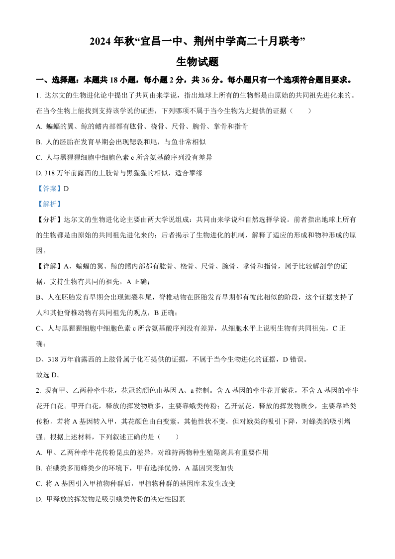 湖北省2024 年秋“宜昌一中、荆州中学”高二十月联考 生物答案