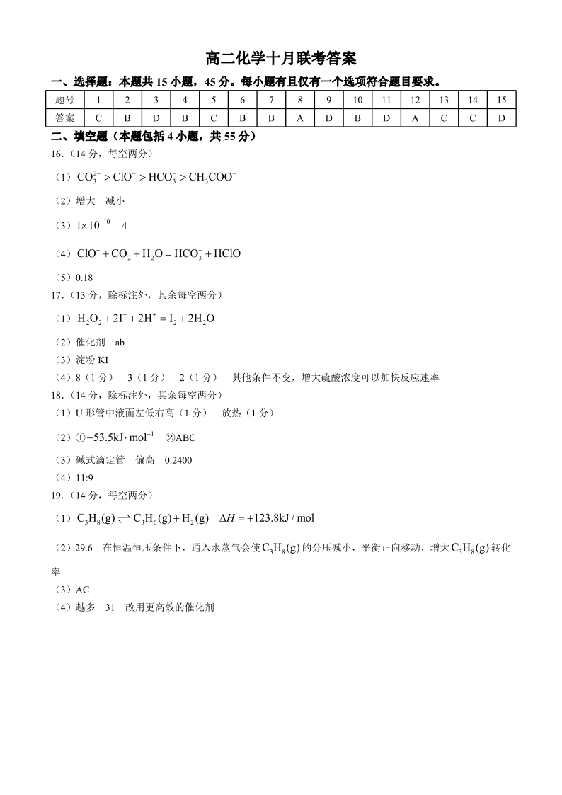 湖北省2024 年秋“宜昌一中、荆州中学”高二十月联考 化学答案