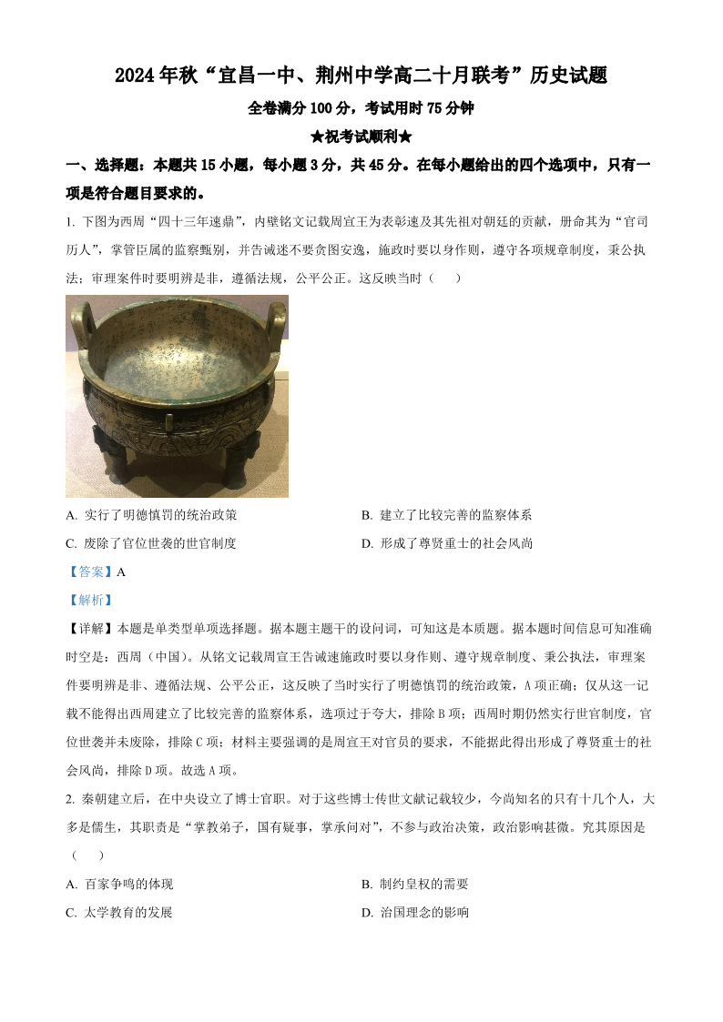 湖北省2024 年秋“宜昌一中、荆州中学”高二十月联考 历史答案